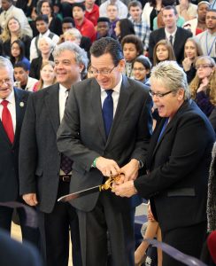 The governor was one of many people on hand to formally open the new Connecticut River Academy at Goodwin College, a 105,000 square-foot, four-story magnet high school located on the College’s River Campus. Though the school has been open since 2010, it has existed in multiple incubator locations, including the College’s main building, while work progressed on a permanent home.